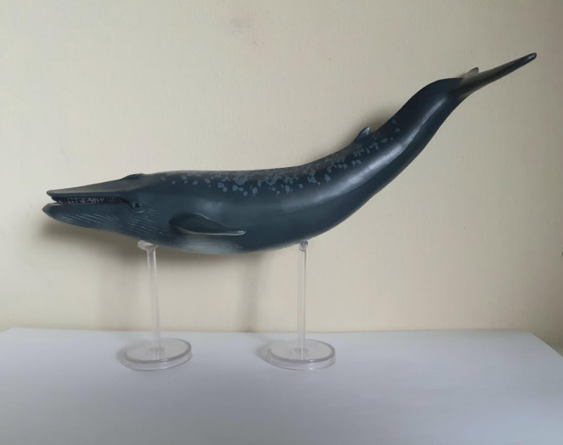 Kinto Favourite ----- The blue whale by this Japanese company is one of the best blue whale models made so far. It has a nice U-shaped rostrum and the colours are pretty good including the baleen. It does suffer from a thin tailstock however, and while not an anatomy issue the pose of the pectoral fins make the figure list to one side so displaying this figure standing on rods or hanging looks better than just putting it on the shelf. Length 25,5 cm